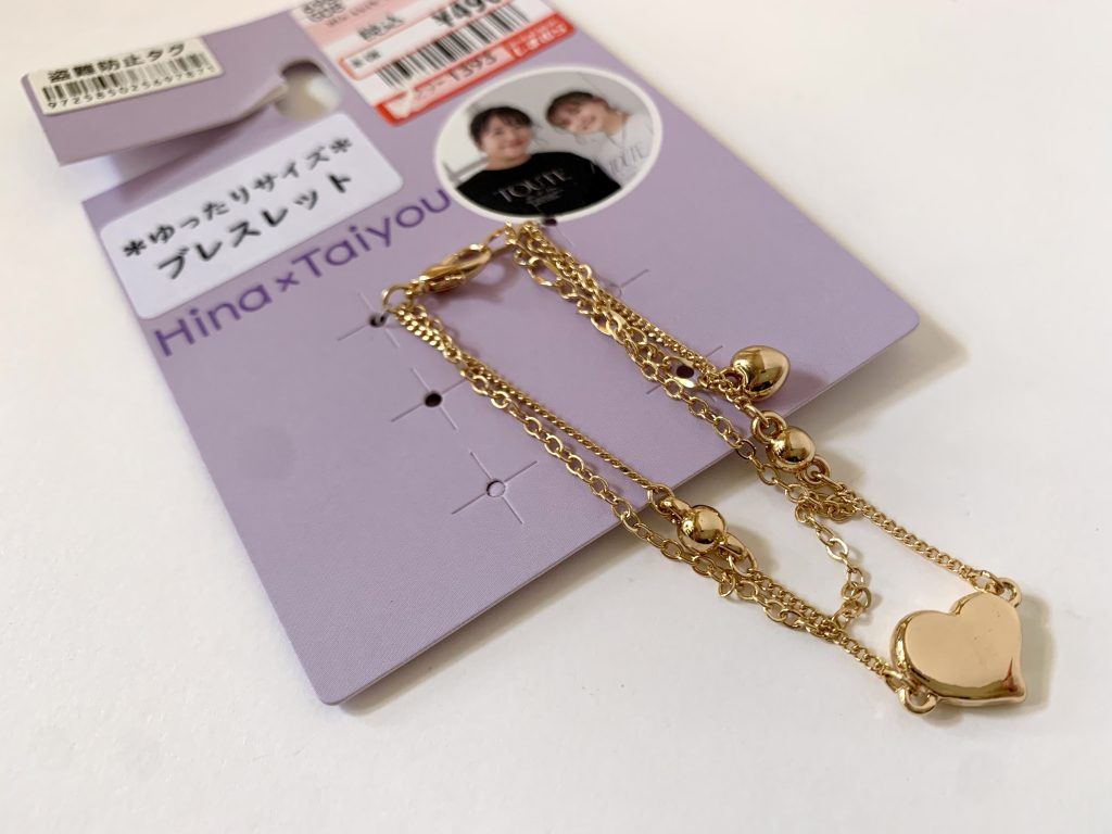 私がしまパトにハマる前の去年7月に発売されたブレスレットが売っていたので買ってしまった…。HinaさんとTaiyouさんのコラボなんて贅沢すぎますよね☆ハートモチーフやっぱりかわいい!値下げはされていませんでしたが元々のお値段(税込¥539)でも激安だし何よりこのお二人のコラボ商品ですよ!?ちなみにこちらもアプリの在庫検索はヒットせず。