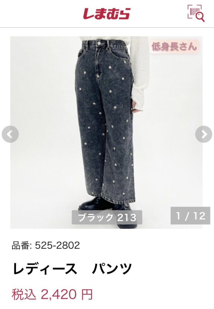 店舗Bでは「Sun.バッグ」だけでなくこちらのデニムにも出会えたんです☆お花の刺繍がめっちゃかわいい☆しかも低身長サイズ(SP、MP、LP)揃っていました。私は149cmで足も短めなので、SP(MPとLPより丈が2cm短い)と念の為MPを持って試着室へ。