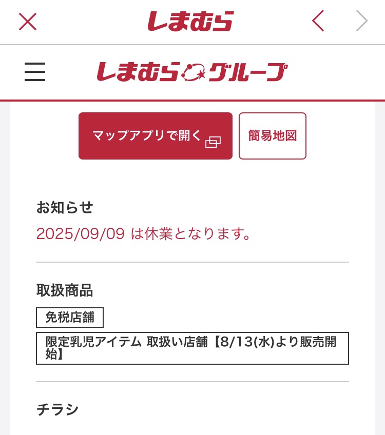 最寄り店舗が9月9日(火)に休業とのこと。先月、棚卸しで8月19日(火)は一部店舗は休業になるというお知らせを見た時に最寄り店舗を検索したらこのお知らせは出なかったので「いつになったら情報更新されるんだ!?」と思ったのですが…私が勝手に「最寄り店舗は8月19日(火)棚卸しで休業日」と思い込んでいただけだったようです。休業日になる場合は店舗検索したら上記のように情報が載るんですね!しまパト二年目、まだまだ学ぶことだらけです(笑)。