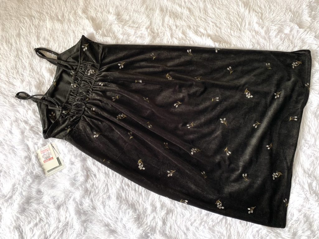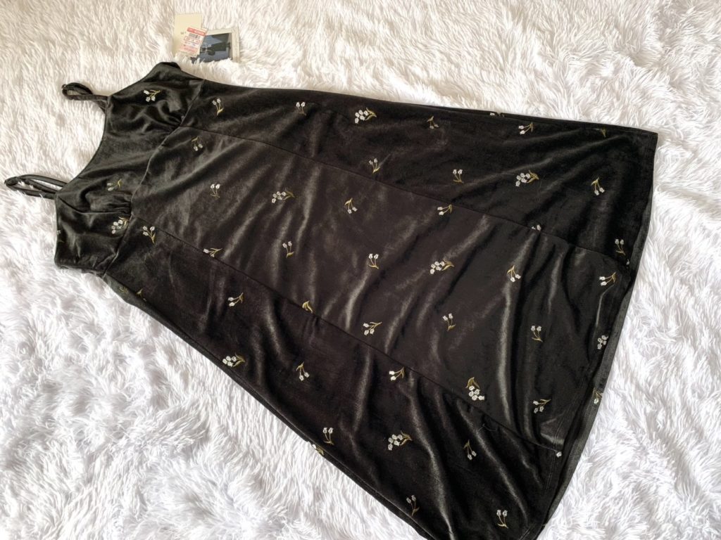 背中部分がゴムで伸縮性があり、足元から余裕で履けて脇の部分も余裕あり!見た目に反して着やすい上に着痩せして見える作り☆だったので(Mでもいけそう)と思いオンラインをチェックしてみると…すでに全サイズ予約終了。恐るべし…でもかわいいから納得。MとLの着丈の差は1cmで肩紐のアジャスターで丈を調整できるし、何よりかわいいのでGETしたい!と試着したLを購入。スズランの刺繍も実物はさらにかわいくて惚れ惚れします!!!