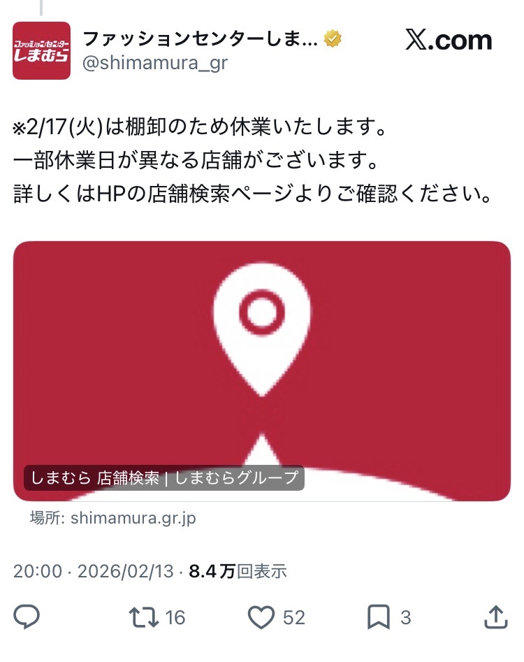 2月17日(火)に棚卸しで休業の店舗が多かったようです。棚卸し日のお知らせはしまむらの公式Xやアプリに数日前(今回は4日前)にアップされることが多い印象。2月と8月にしまパトの予定を立てる際は、ある程度棚卸しになりそうな日を予想しないといけませんね。